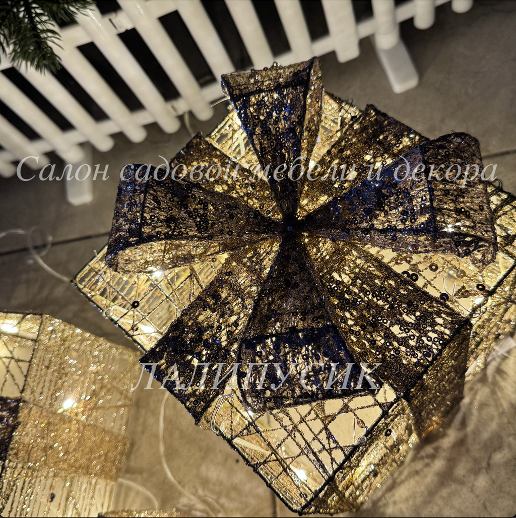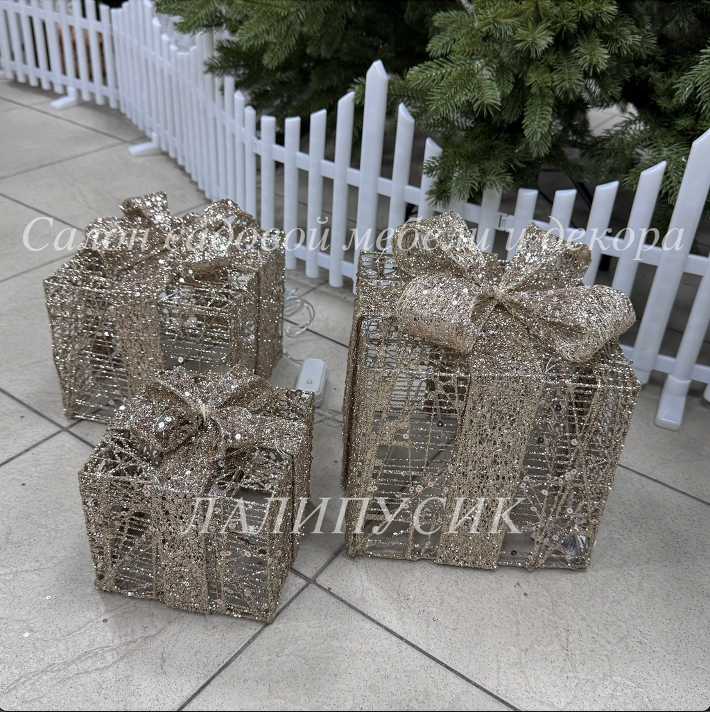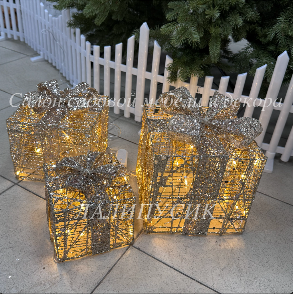 Новогодняя светящаяся фигура под ёлку отличное украшение интерьера в Новый год и Рождество. Новогодние подарки полые, без одной из сторон, что делает их более компактными для хранения, так как их можно сложить друг в друга.