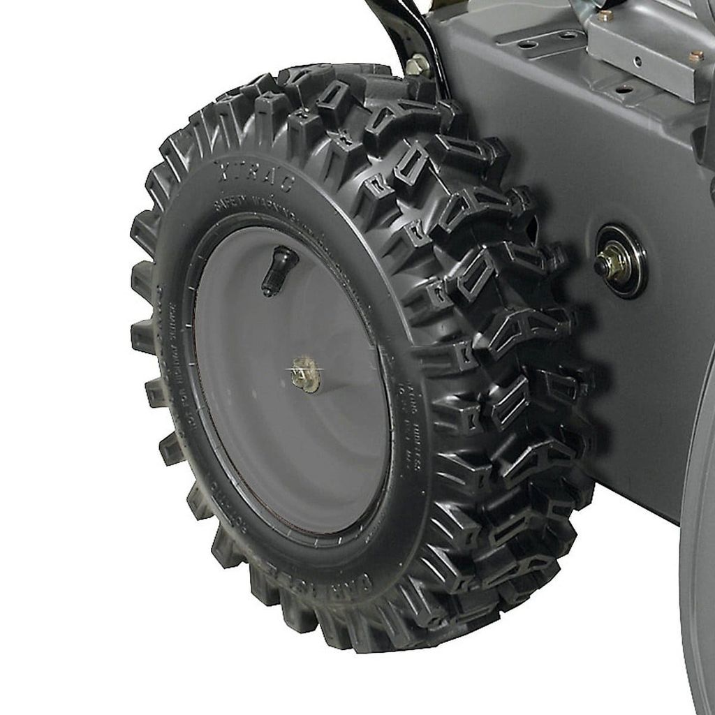 - Колеса. Снегоуборщик оснащен специальными колесами, которые имеют отличное сцепление с поверхностью и способны проходить по наклону и по скользкой дороге. Такие колеса обеспечивают движение на обледенелых поверхностях.