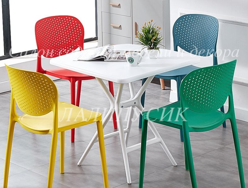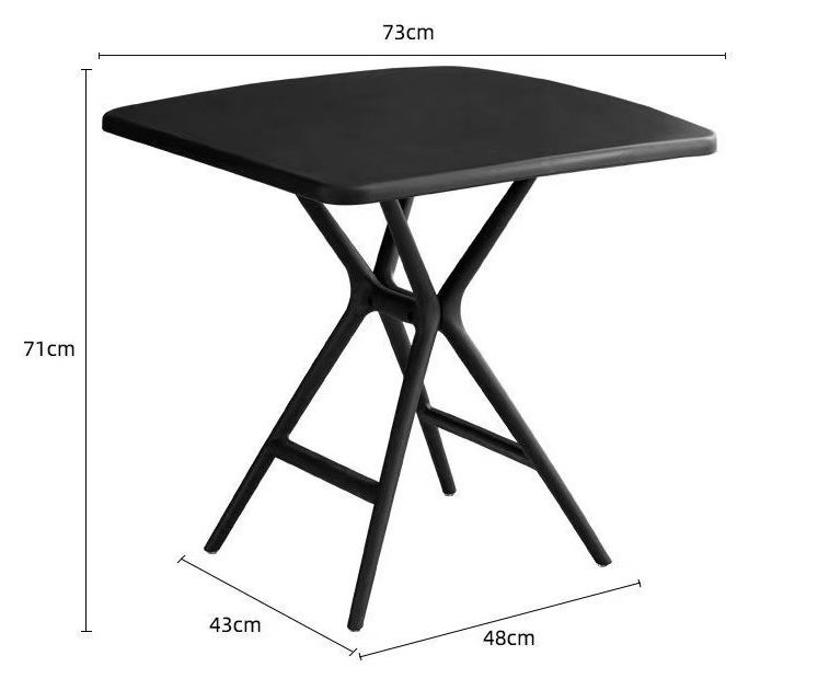 Квадратная столешница размером 73х73 см выполнена из качественного пластика черного цвета толщиной 2 см. Ножки также изготовлены из плотного пластика с резиновыми накладками.