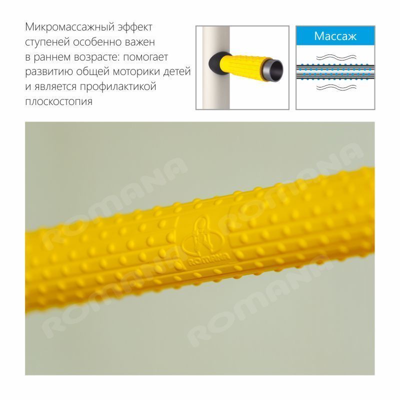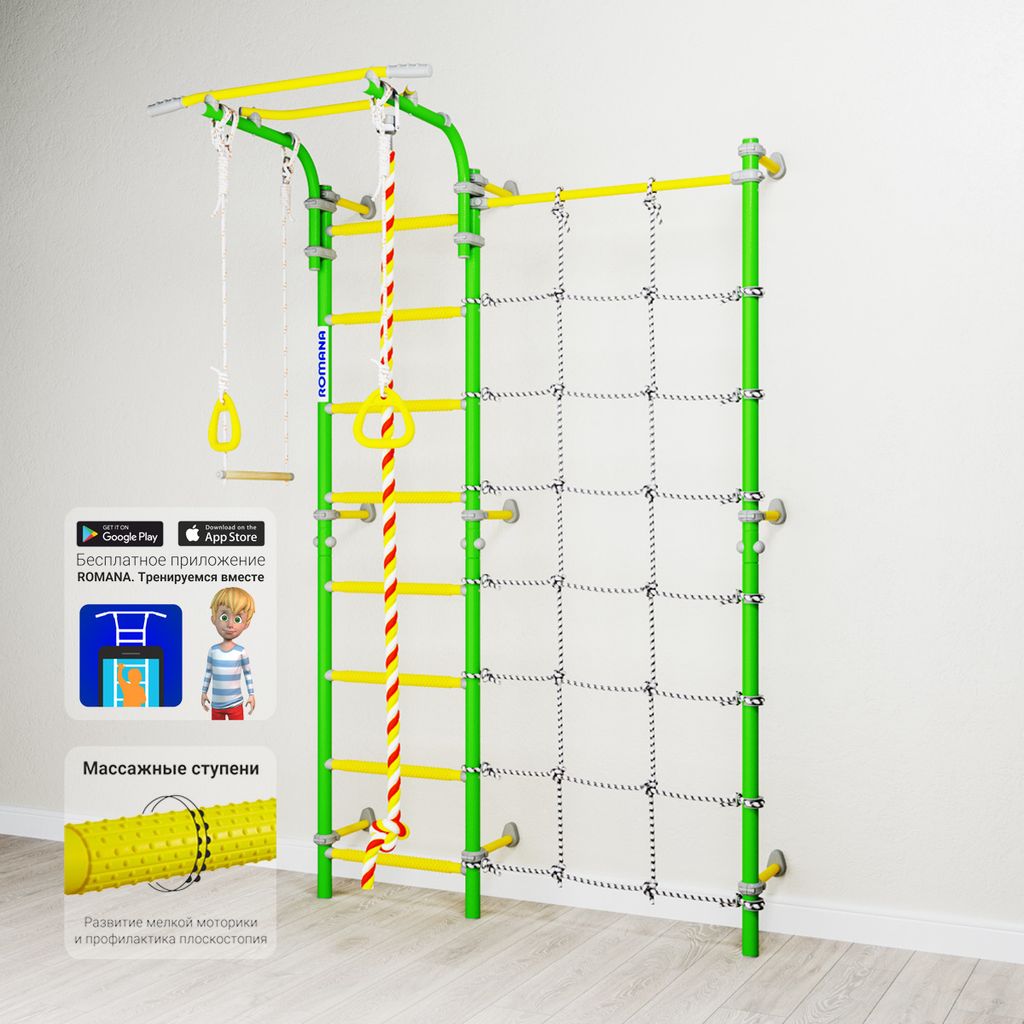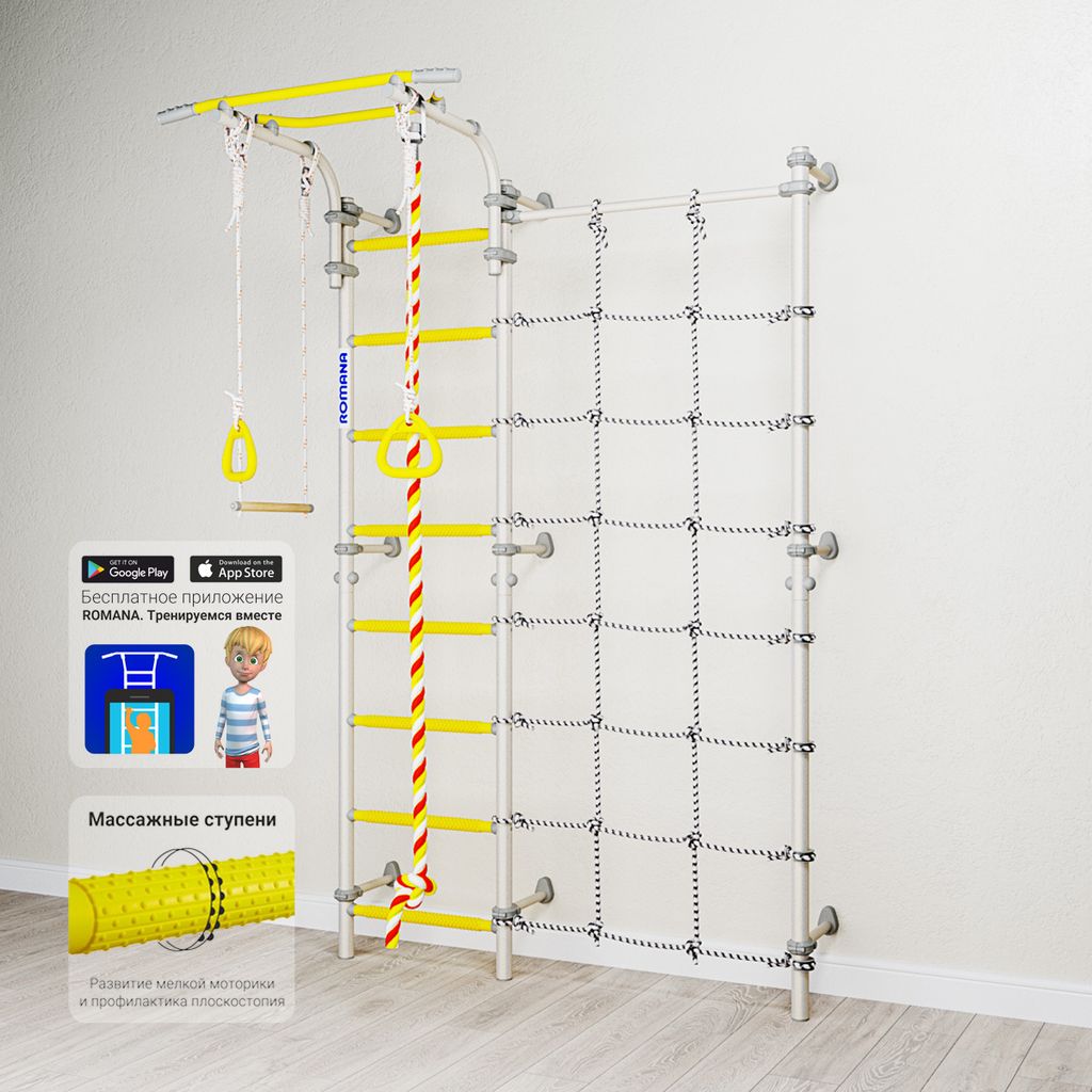В комплекте: лестница гимнастическая, турник подвижный, кольца гимнастические, трапеция, канат, сетка для лазания.
