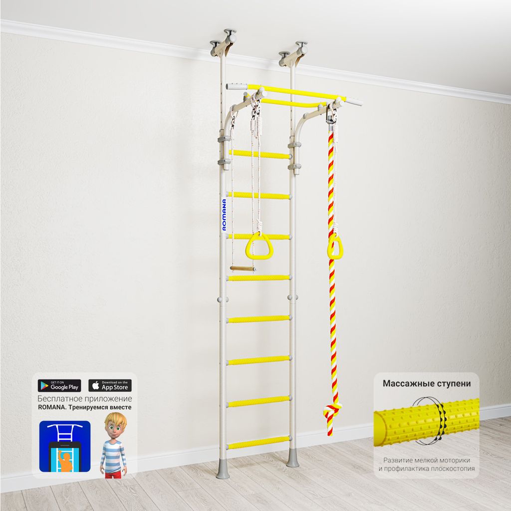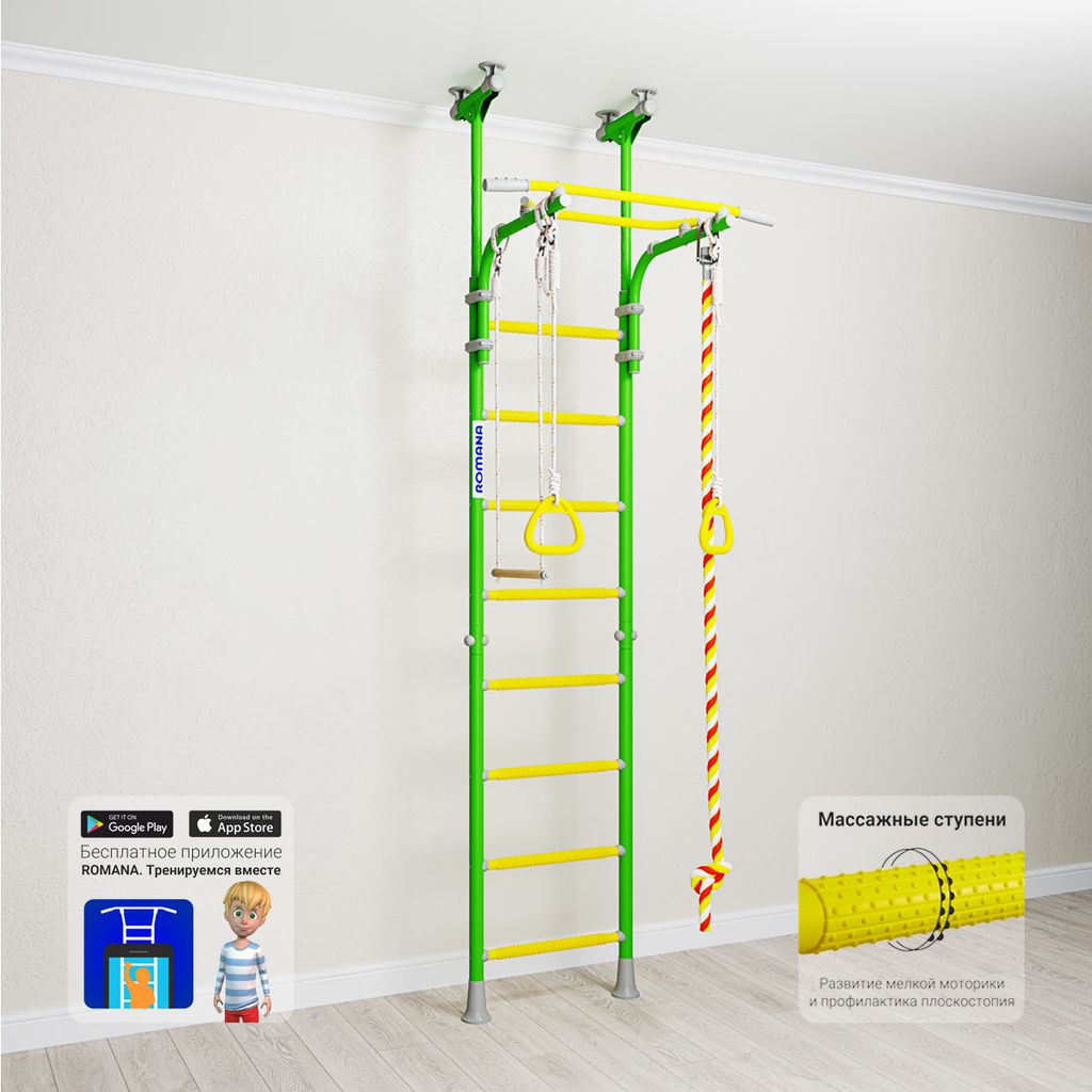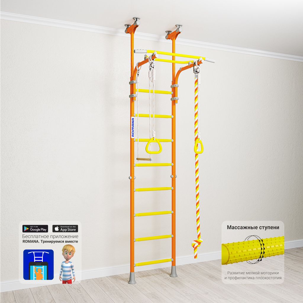 Шведская стенка Комета S5 использует внедренную ступень antislip (антискользящая), обеспечивающая более крепкий хват. Микромассажный эффект остальных ступеней помогает развитию общей моторики детей и является профилактикой плоскостопия. Современная шведская стенка с регулируемым по высоте турником. Важное преимущество при монтаже этого комплекса — не нужно ничего сверлить!
