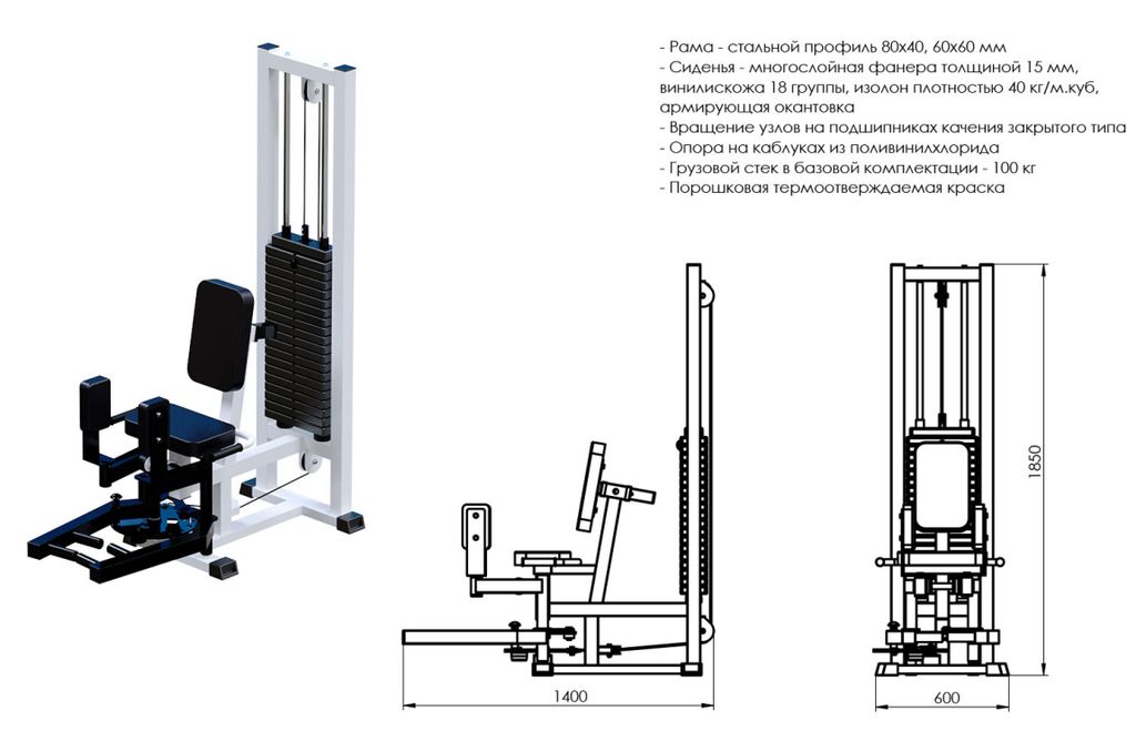 • Конструкция тренажера изготовлена из стального профиля 60х60мм, 80х40мм, в изделии используется конструкционный профиль толщиной 2 и 3мм в зависимости от прилагаемой нагрузки;