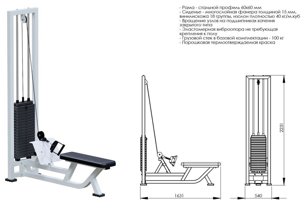 - Грузоблочный стек тренажера состоит из металлических обрезиненных плит весом по 5кг, и хромированных направляющих. Изменение нагрузки происходит при помощи металлической иглы(фиксатора). Для приведения в движение грузов используется трос 5 мм в пвх оплетке с усилием на разрыв 500 кг с максимальной нагрузкой – 800кг. Грузовой стек в базовой комплектации – 100кг;
