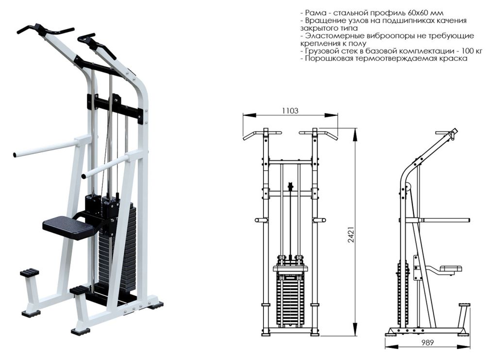 - Конструкция тренажера изготовлена из стального профиля 60х60мм, в изделии используется конструкционный профиль толщиной 2 и 3мм в зависимости от прилагаемой нагрузки;