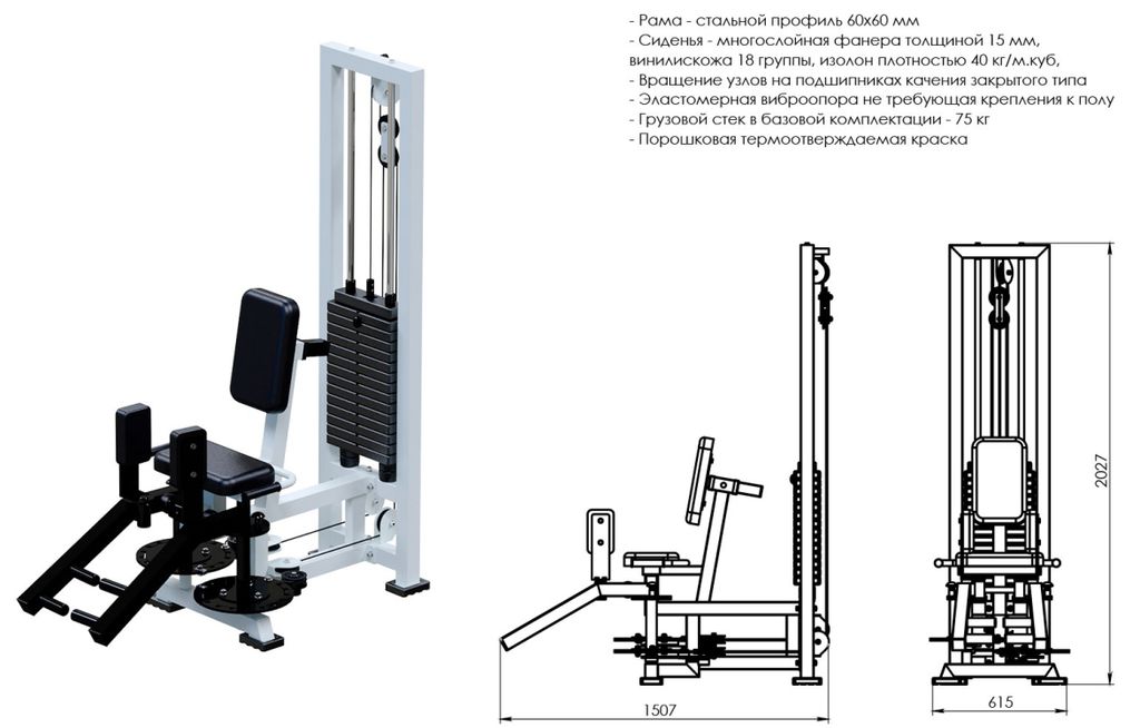 - Грузоблочный стек тренажера состоит из металлических обрезиненных плит весом по 5кг, и хромированных направляющих. Изменение нагрузки происходит при помощи металлической иглы(фиксатора). Для приведения в движение грузов используется трос 5 мм в пвх оплетке с усилием на разрыв 500 кг с максимальной нагрузкой – 800кг. Грузовой стек в базовой комплектации – 75кг;