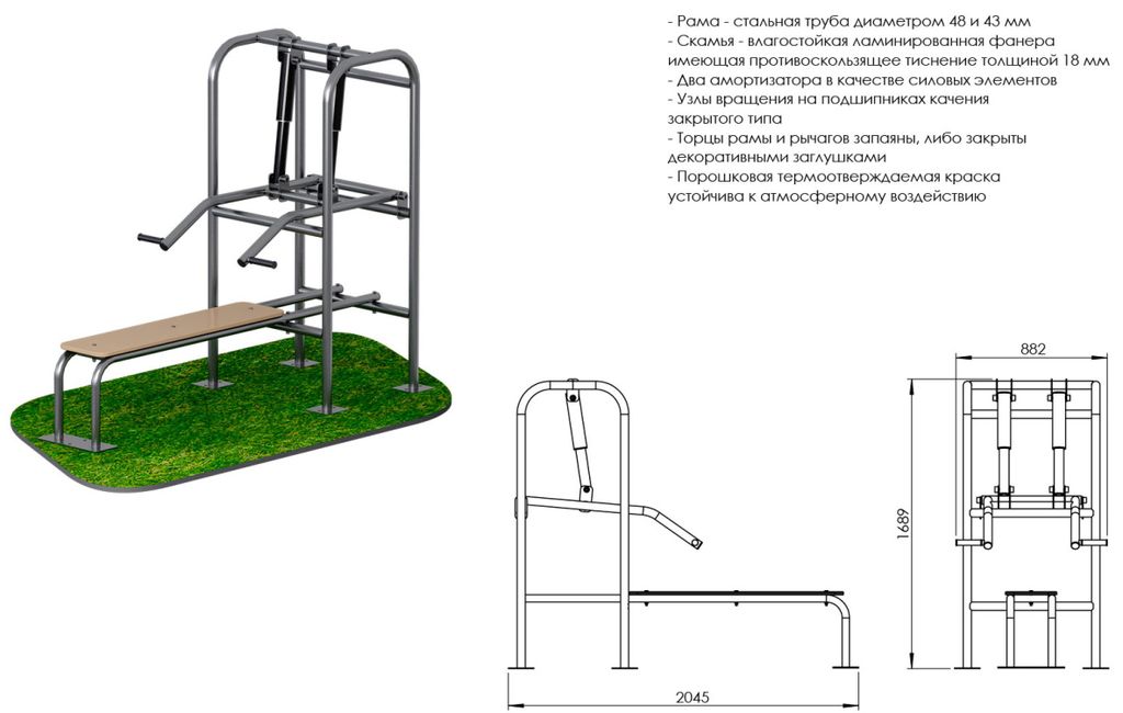 - Тренажер крепится на закладной элемент, который монтируется на глубину 500 мм и представляет собой платформу из листа с армирующей обвязкой. Размеры закладного элемента 300х300мм с межцентровым расстоянием шпилек 240 мм, высота шпильки 30 мм над уровнем закладного, диаметр шпильки 16 мм. Гайки утапливаются в антивандальное гнездо тренажера, оснащенное заглушкой от выкручивания;