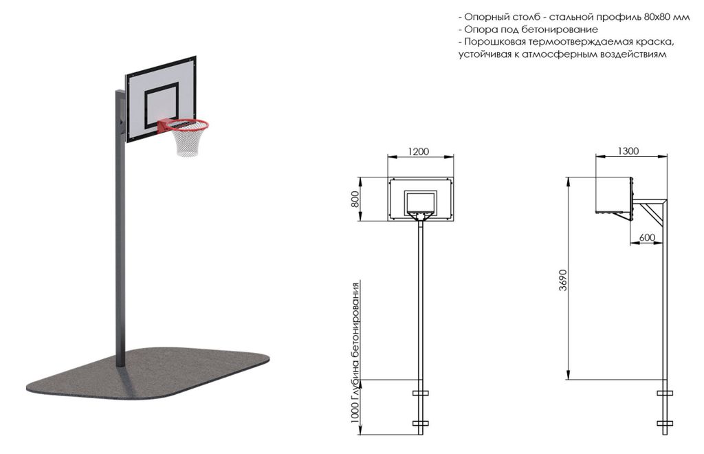 - Стойка оснащена щитом и кольцом с сеткой, соответствующей требованиям ГОСТ Р 56434-2015 . Щит размерами 1200х800х9 мм изготовлен из влагостойкой фанеры;