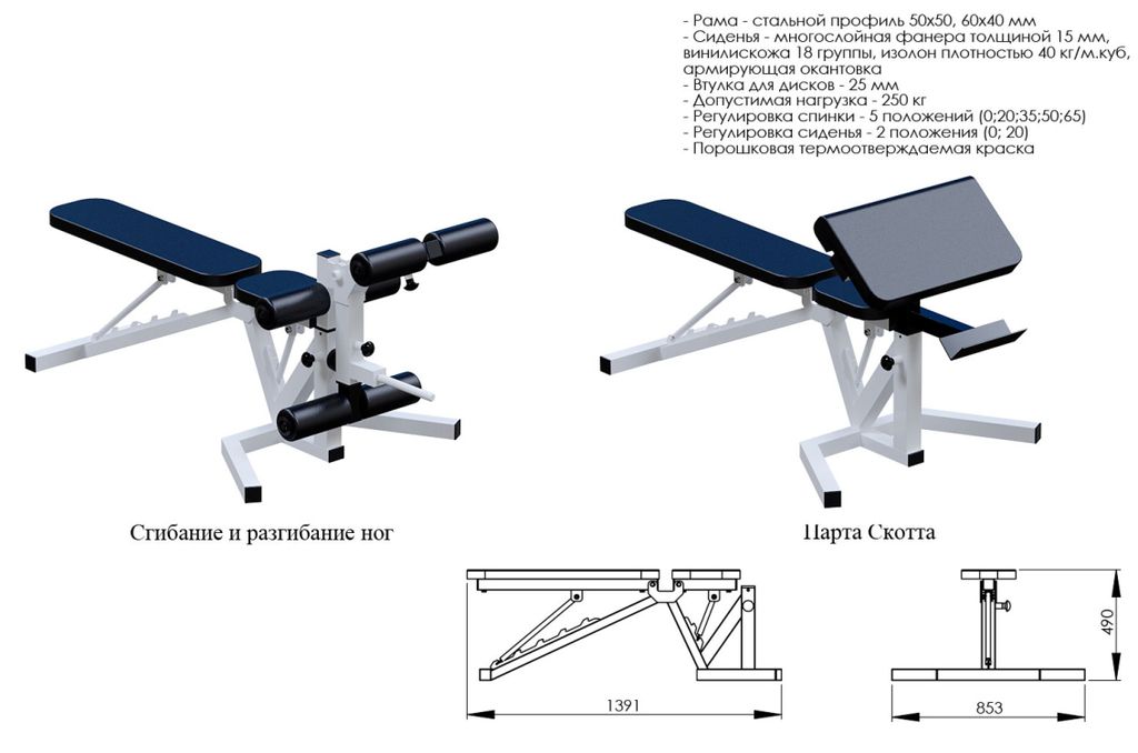- Дополнительные съемные парта скотта и сгибание-разгибание ног с посадочной втулкой на 25мм;