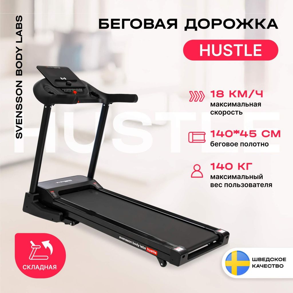 SVENSSON BODY LABS HUSTLE — ваш идеальный партнер для домашних тренировок. Оснащенная мощным двигателем Mitsubishi Motors Corporation на 2.5 л.с. (пиковая мощность 4.5 л.с.), она обеспечивает плавный и стабильный бег со скоростью от 1 до 18 км/ч. Электронная регулировка наклона от 1% до 18% добавляет тренировкам реалистичности и помогает прорабатывать разные группы мышц, создавая эффект подъема в гору.