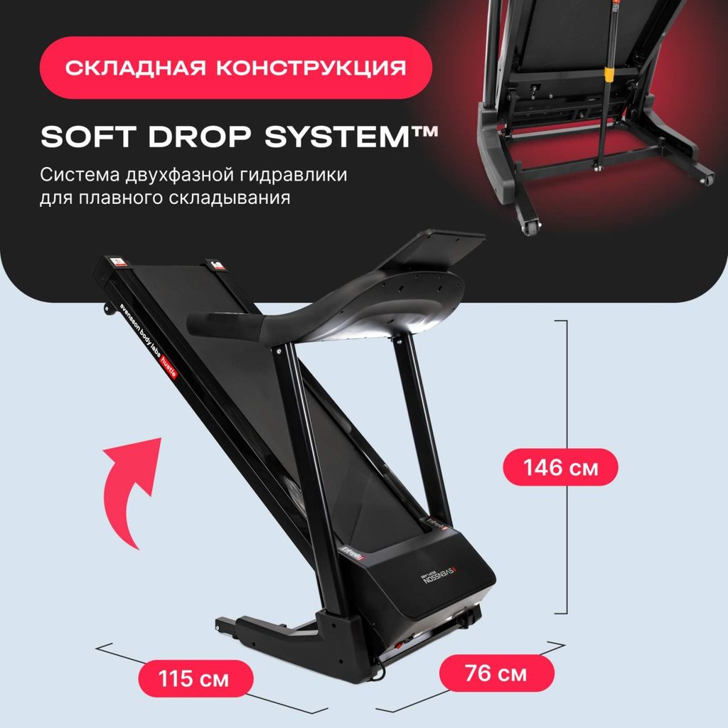 Комфорт во время занятий обеспечивают просторное беговое полотно размером 140x45 см и амортизационная система с 8 эластомерами VCS™, которые снижают нагрузку на суставы и делают бег мягче. Прочные материалы, включая многослойное полотно Diamond и парафинированную деку толщиной 15 мм, гарантируют долговечность и надежность даже при интенсивной эксплуатации. Уникальные функции, такие как управление скоростью и наклоном на поручнях, встроенные Bluetooth-колонки для воспроизведения музыки, беспроводная зарядка для смартфонов и подставка под гаджеты, делают каждую тренировку максимально удобной. А мягкая система складывания Soft Drop System позволяет компактно хранить дорожку, экономя место в вашем доме.