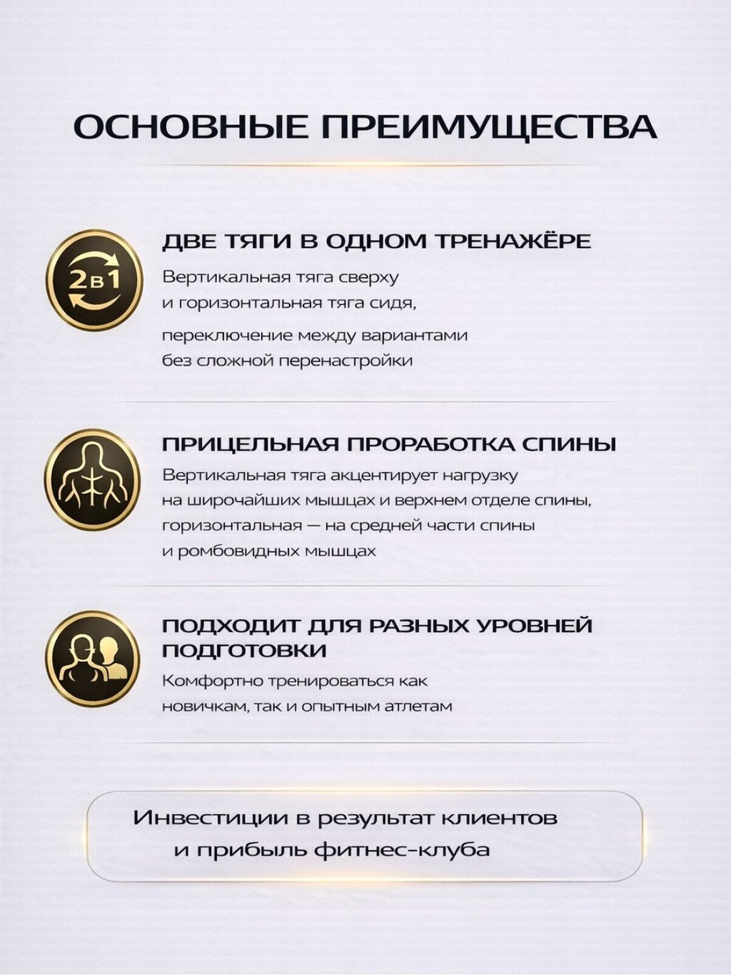 За счёт фиксированной траектории движения и удобной посадки тренажёр позволяет безопасно развивать силу и массу широчайших мышц, средней части спины и бицепса, оставаясь понятным и доступным для пользователей любого уровня подготовки.