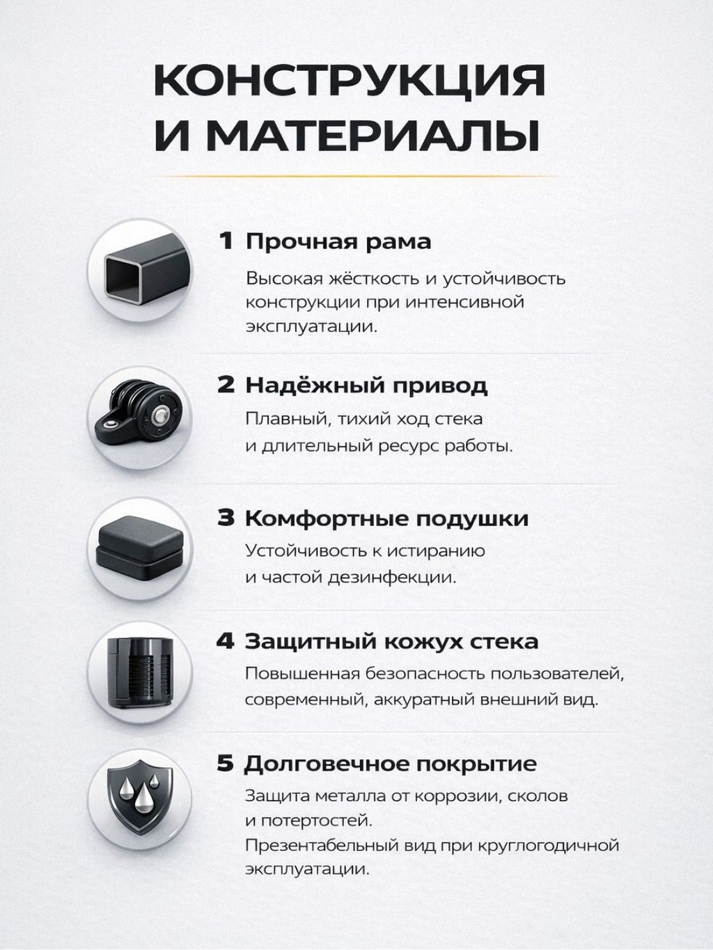 • Прочная рама. Каркас выполнен из плоско-овального профиля 53×156×3 мм и 50×100×3 мм, что обеспечивает высокую жёсткость и устойчивость конструкции при интенсивной эксплуатации.